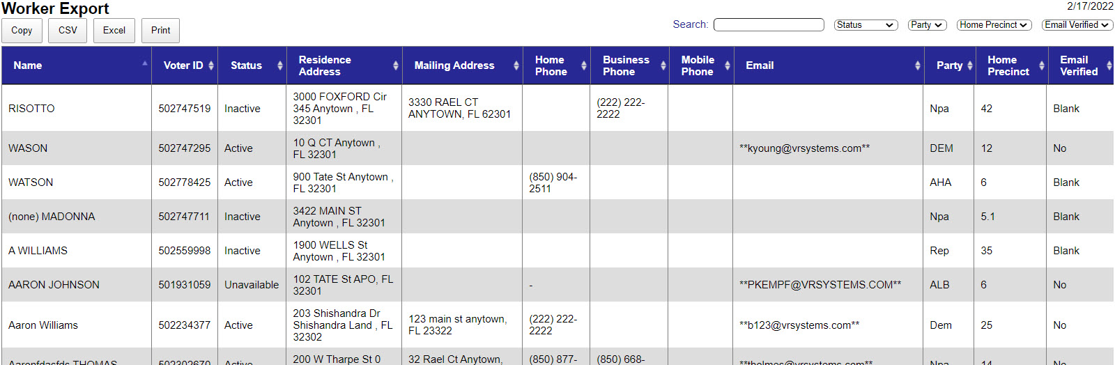 The Worker Export report looks at all student data, including name, residence and mailing addresses, phone number, email address, party, and home precinct.