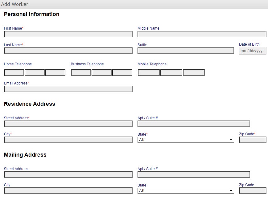 Note: See Verify Worker Email Addresses for instructions on how to verify email addresses as valid.Note: The Mailing Address fields are considered required when the worker prefers mail be delivered to an address that is different from the residence. - (Optional) Assign the worker a password. If a password is left blank, the worker will be prompted to create a password upon their first log in.