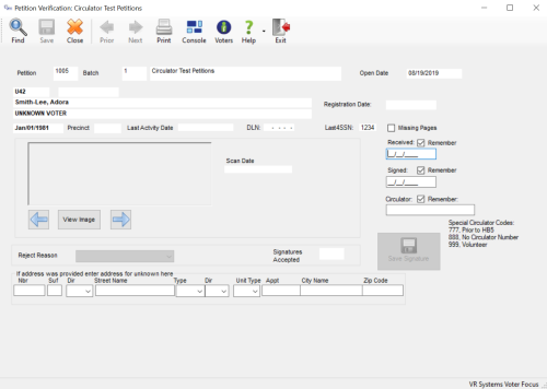 To access: PETITIONS > Verify Signatures > {select image to process} > Unknown Voter