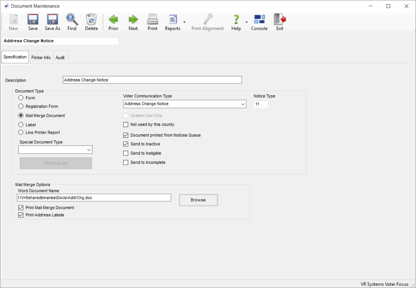 The document type is selected when you create the document. It can be modified here, if needed. Form—Select when the document is either a pre-printed or digital form that includes voter information and other data—such as the voter's address or a message from the Supervisor. Voter information cards and final notices are examples of the Form document type. For this document type, click Form Layout to specify the fields (either database or text) to include and their locations on the form. If you have several iterations of a form on a single printed sheet—such as a sheet of two postcards—you'll click Label Layout to define how the forms are arranged on the page, similar to the way you'd set up a sheet of mailing labels. If you are printing a digital version of the form, you'll also click Printer Info > Graphics and locate the image file. Registration Form—Select when the document is either a printed or digital version of the Florida Voter Registration Application. Most counties today use the digital form, which is a GIF file provided by VR Systems. The file is stored on your system in the folder \VR6Sharedbinaries with a name like 2025 Registration Form.gif. This registration form is mailed along with an incomplete registration notice to applicants whose previous application was incomplete or with a petition address change notice to voters who signed a petition with a different address from the one on file. When printed, the document contains data from the incomplete application or the voter's new address from the petition. For this document type, the Special Document Type field is automatically pre-filled with Registration Form when you first create the document. Leave this value if the document is going to incomplete applicants. For the form accompanying the petition address change notice, you must create a separate registration form document and select Petn Address Change in the Special Document Type field. For this document type, you'll click Form Layout to specify the fields (either database or text) to include and their locations on the form. If you are printing the digital version of the form, you'll also click Printer Info > Graphics and locate the GIF file. Mail Merge Document—Select when the document is a letter or other piece of communication created from a Microsoft Word mail merge document that includes the voter's name, address, and other data that is inserted using mail merge fields. The Word file must reside in I:\VR6Sharedbinaries\Docs and its path name must be entered in Word Document Name in the Mail Merge Options box. To learn how to create the mail merge Word document that can be selected as the template for this document type, see Create a Mail Merge Document. Mail merge documents are printed only on page or laser printers. They cannot be printed on line printers. Note: Certain election worker documents must