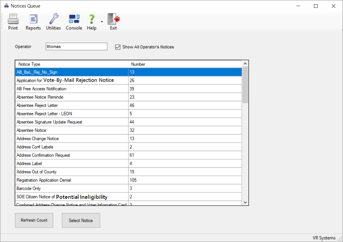 Displays the user name of the person currently logged in to Voter Focus. When you first display the Notices Queue, only the notices scheduled by that operator—including actions taken by the operator that caused a notice to be scheduled automatically—are displayed in the list of notices. To see notices for a different operator, enter their user name and click Refresh Count. |
