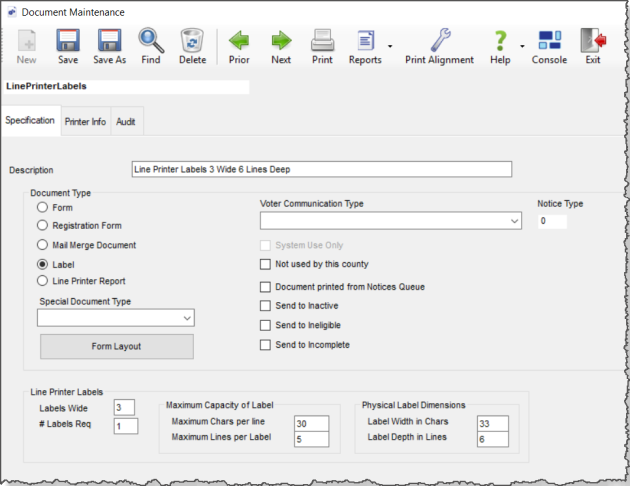 - On the Select Document dialog, select a document type, such as Line Printer Labels 3 Wide 6 Lines Deep. The Document Maintenance dialog displays.
