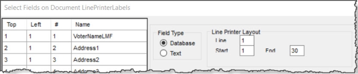 In FlexRep, all that is involved is selecting an output option for Voter Focus Document and selecting the document name (in the example here the document name is Line Printer Labels 3 Wide 6 Lines Deep), specifying the selection criteria to find the voters, running the report, and printing it to a printer where label stationery is loaded.