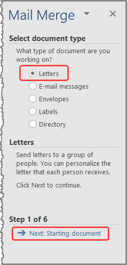 - On the Mail Merge panel that opens to the right of the page, leave the default selection of Letters and click Next: Starting document.