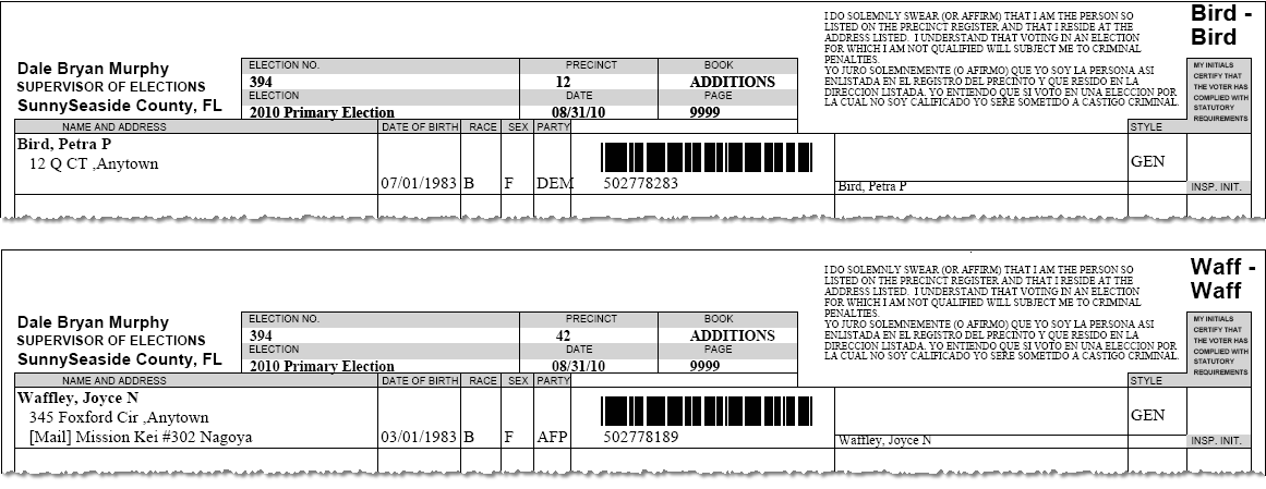 Changes formatted for label sheets. A label is produced for each voter who had a change. The labels can be affixed to the precinct register, saving workers the effort of handwriting or stamping the change. And a label can be removed easily if a mistake is made.