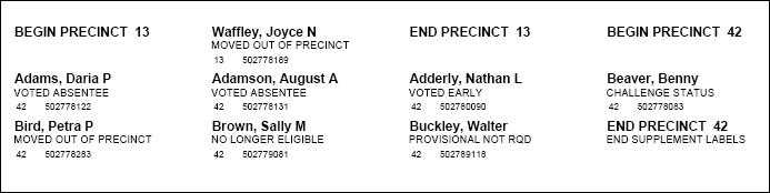 If you print a supplement for more than one precinct and are not doing a final supplement run, there is no page break between precincts, so you are likely to have voters from different precincts on the same page of labels. For the final supplement run, the label sheets have a page break after each precinct, so each precinct's changes can be given to precinct clerks.