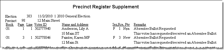 Additions pages are printed only when you indicate you are printing the final supplement run. They list voters who have moved into the precinct or are newly eligible to vote. You should print the Additions pages only when you are sure that the last supplement has been generated. Separate the Additions pages by precinct and insert each precinct's Additions pages at the back of the precinct register.