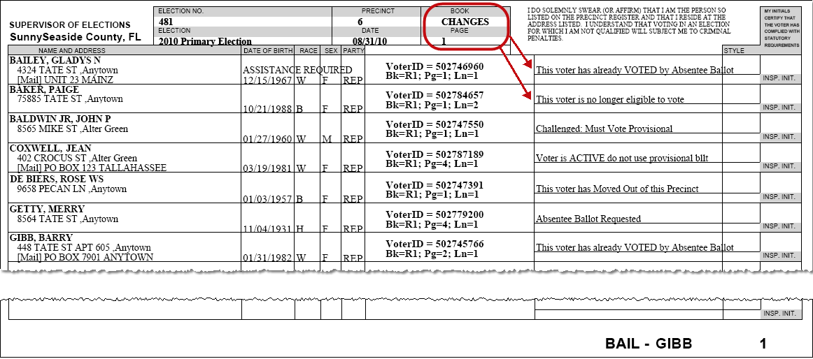 Elections office staff or precinct clerks should manually update the precinct register for those voters listed in the Changes section. This can be done by rubber stamp, handwriting, or whatever method your county uses.