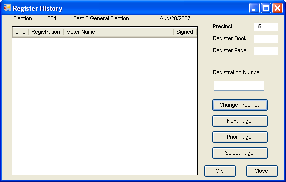 On the Select Precinct dialog, click the precinct you are processing. The Register History dialog appears.