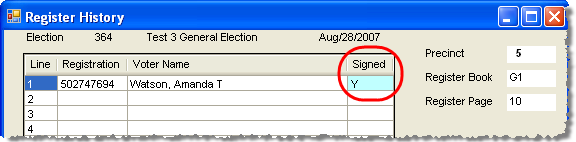When you swipe a bar code accurately, the voter appears on the Register History dialog, with a Y in the Signed column.