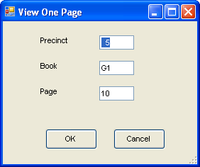 During final inspection of the precinct registers, should you want to access the records for a specific page, click Select Page, enter the precinct, book and page number you want to see, and click OK.