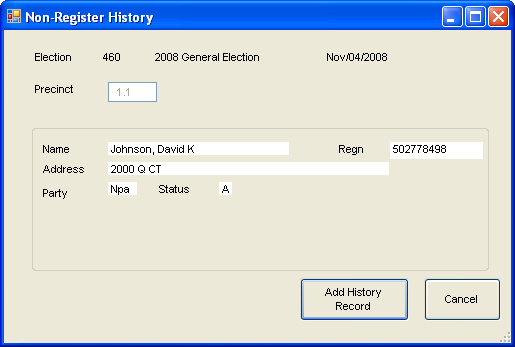 If you are certain that you have the right voter, click Add History Record to record that the voter voted in this precinct. If you don't have the right voter, click Cancel and search again.