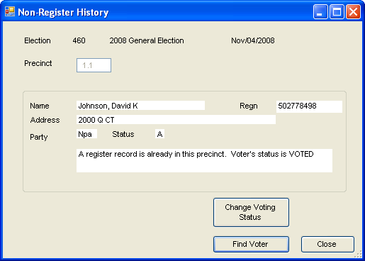 Following an election, one of the post-election tasks is to enter the voting history of voters who have moved into a precinct (or city ward) but were not listed in the precinct register of their new precinct. This usually happens when a voter notifies the county of an address change on election day. Such voters are usually hand-written into the blank pages at the back of precinct registers. We refer to this type of voting history as non-register history.