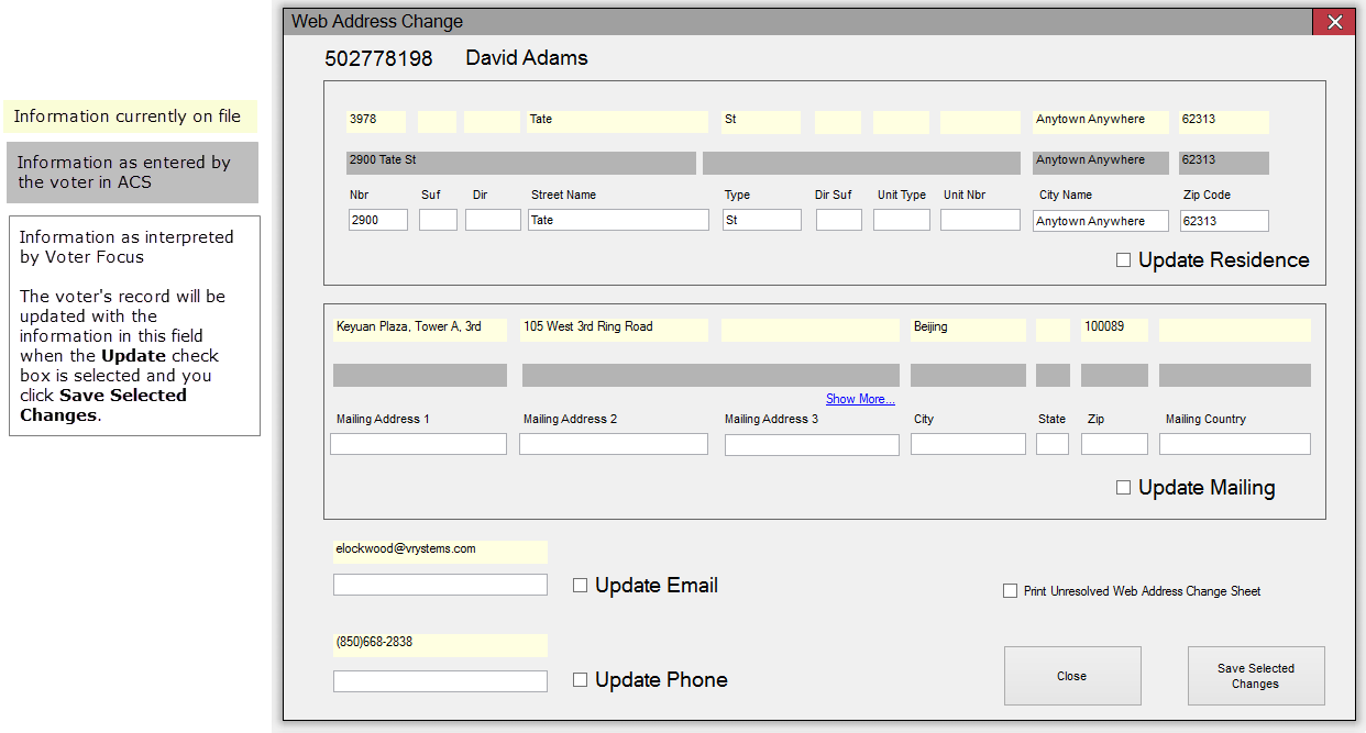As a result, you'll need to carefully review the information provided in the gray mailing address fields to determine if the information provided by the voter is captured as expected in the white mailing address fields and make changes if not.