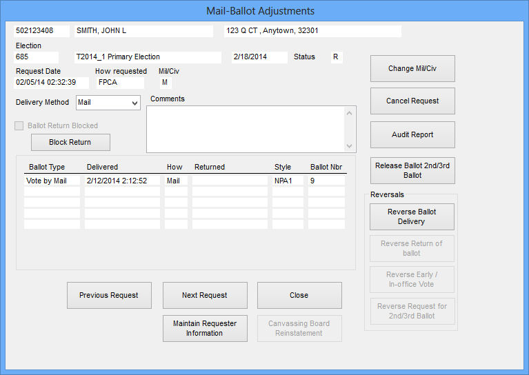 On the Mail-Ballot Adjustments dialog, only the changes allowed to the request are enabled. For example, the Reverse Return of Ballot button will be disabled if the voter has not returned an issued ballot or cast an early vote.