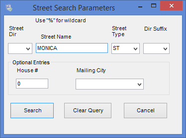 The Street Search Parameters dialog helps you find the valid expression of a street address when you get an invalid address message while creating or maintaining a voter registration record.