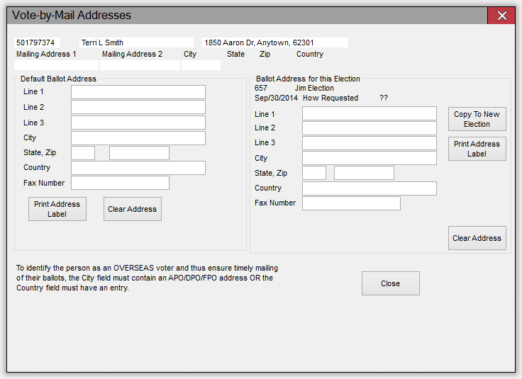 Voters who request mail ballots have the option of providing the elections office with addresses to which ballots should be sent other than their mailing or residence address. When such alternate addresses are provided, they are maintained on the Vote-by-Mail Addresses dialog. The dialog has space for two types of addresses: