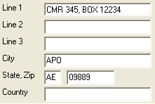 the text APO, DPO, or FPO in the City field and the appropriate APO/DPO/FPO address in the State and Zip fields. For example: