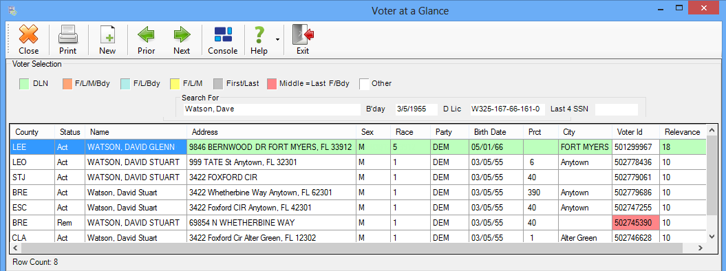 Matching records are ranked in order of relevancy—that is, with the records most likely to be the one you are looking for displayed at the top. Each record in the search results will display a ranking number in the Relevance column (which you might have to scroll to the right to see). The number is the sum of points assigned for the fields in the record matching the search criteria. As you can see from the list below, a matching driver license number will give a record the highest ranking, so driver license matches will appear at the top of the list. Records with matching birth dates or Social Security Numbers will also receive a high ranking. Application-search results having the same relevancy score are sorted alphabetically by name. As with other tabular matter in Voter Focus, you can re-sort the results by clicking a column header.